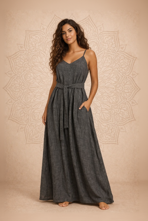 Fatti ispirare dal vestito lungo Bamboo Plant di Baba Design, una scelta di qualità per chi desidera un look elegante. Realizzato con una linea a piombo che esalta la figura femminile, ha inoltre il dettaglio cintura mobile per evidenziare la vita. Perfetto per ogni occasione.