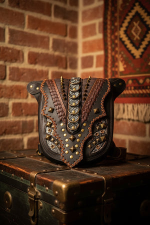 Le borchie in ottone e gli anelli metallici donano un look tribale e deciso, perfetto per festival, concerti, viaggi o la vita quotidiana di chi non vuole passare inosservato.