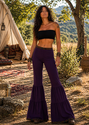 Pantalone a zampa, modello leggings. Nella sua semplicità risulta ideale per slanciare la figura femminile. Elastico di 3 cm in vita. La zampa è sottolineata dalle balze.