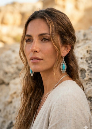 Orecchini pendenti in argento 925 dalla forma allungata a goccia che incarnano grazia ed eleganza senza tempo. Al centro, una splendida pietra di Turchese naturale cattura la luce con le sue venature uniche, simbolo di protezione e saggezza.