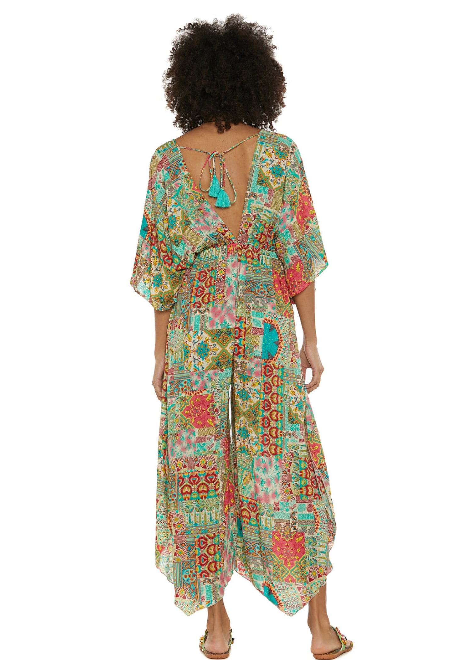 Tuta dal taglio morbido con vita impero regolata da fascia elastica. Design elegante con maniche a tre quarti fluttuanti e scollo a V simmetrico sia sul davanti che sul retro. Un capo versatile che unisce comfort e stile.