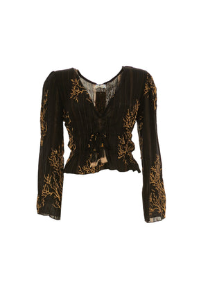 Una maglia elegante con il suo print dorato, realizzata in crepe di viscosa. Maniche lunghe e scollo a V. Il bustino arricciato offre una vestibilità perfetta per un look boho gypsy..
