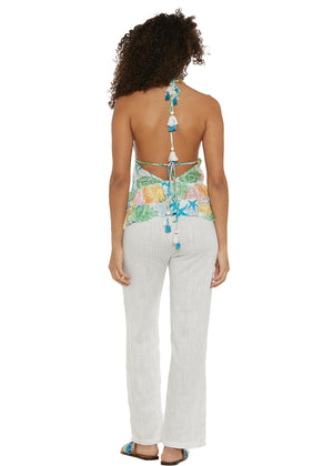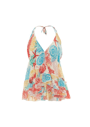 Top dal taglio svasato realizzato con un pattern marino dai colori tenui. La schiena è scoperta e lo scollo a bikini si regola posteriormente tramite laccetti di tessuto. Le nappe in cotone conferiscono un tocco di stile in più.