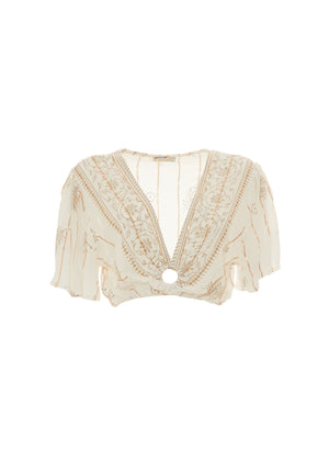 Top corto di Baba Design in crepe di viscosa dallo stile boho gypsy. Maniche corte morbide e un dettaglio ad anello sul profondo scollo a V anteriore. Con il suo print color oro, aggiungerà un tocco di eleganza al tuo look.