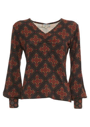 Scopri la maglia City Canvas di Baba Design, la tua prossima scelta di stile retrò. Con una linea avvitata e la manica a sbuffo, è il perfetto mix di classico e moderno. Il morbido tessuto di viscosa e il pattern geometrico completano il look.