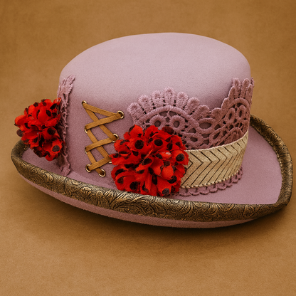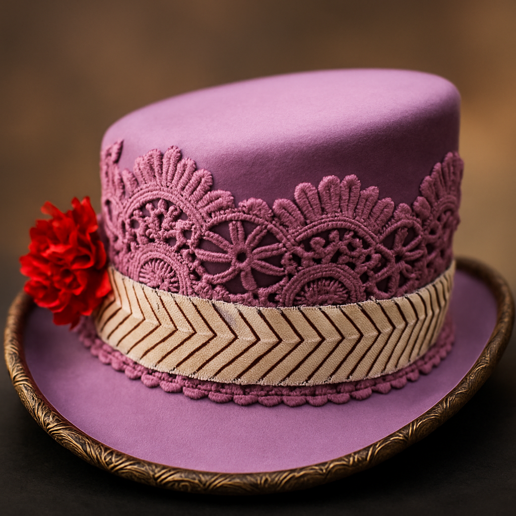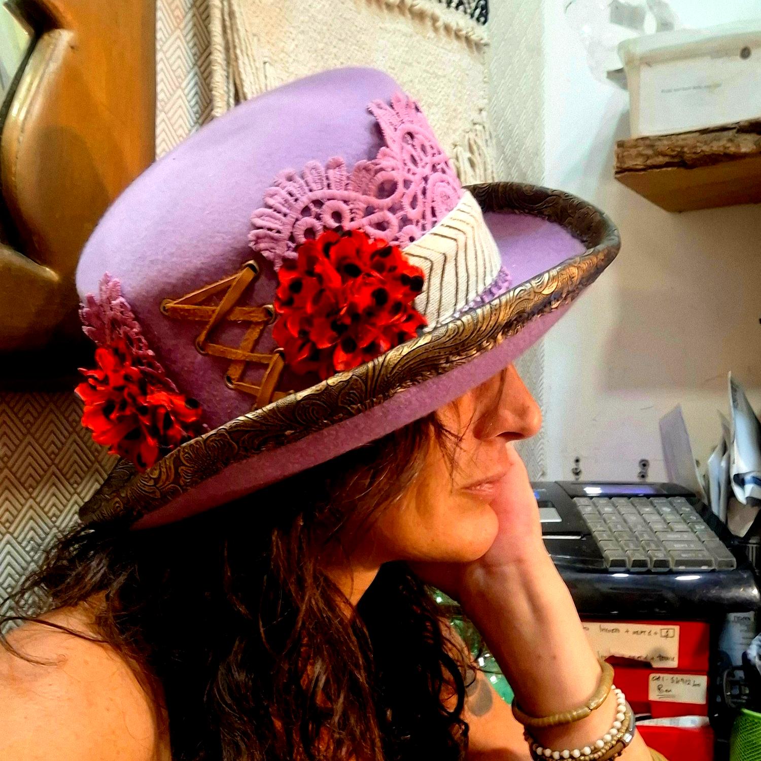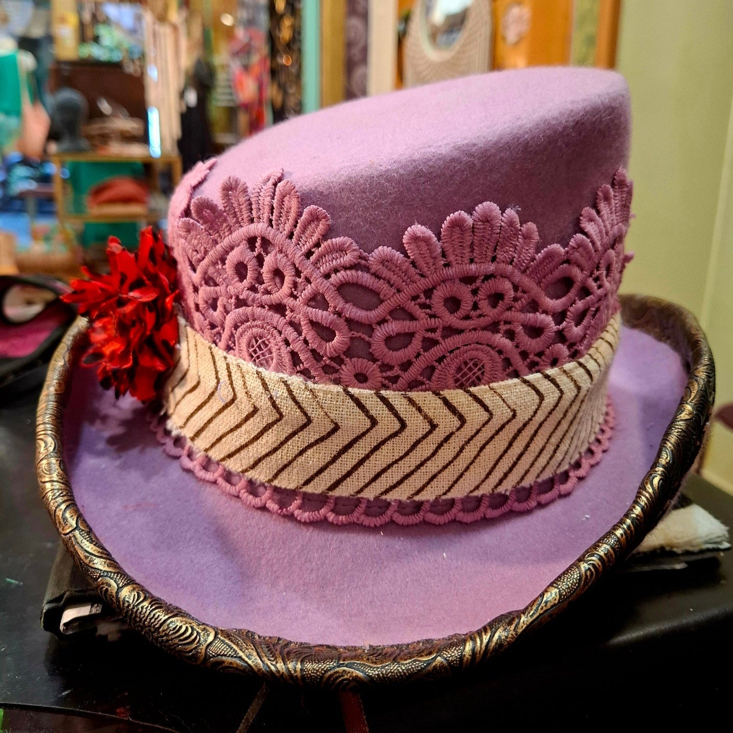 Fall in love with this extraordinary purple felt top hat with an asymmetrical design, designed for those who love to stand out. The brim is embellished with a refined bronzed textured leather trim, adding a touch of vintage and boho elegance.