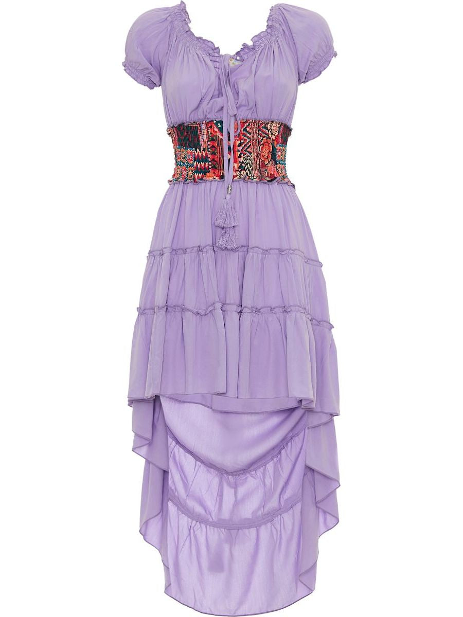 Seductive asymmetric dress in solid color, with wide and adjustable bateau neckline. A wide patterned band wraps around the bust and enhances the shape. The skirt features flounces that create movement and the puffed sleeves give a touch of romance. Experience this creative design by Baba Design.