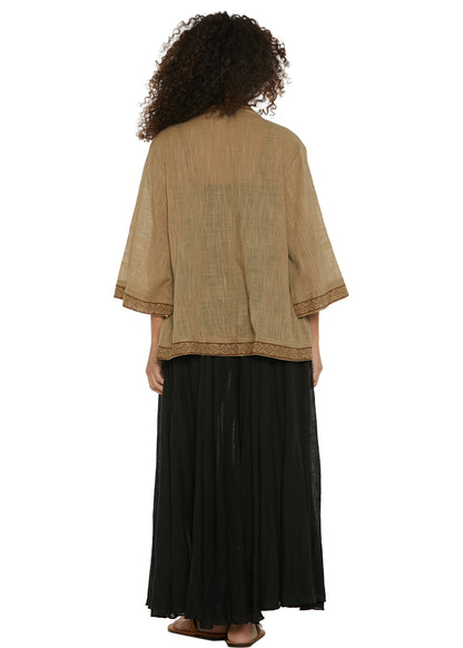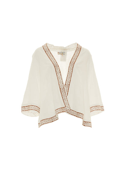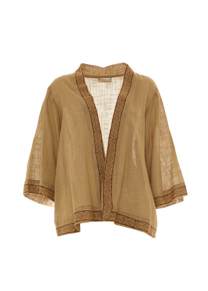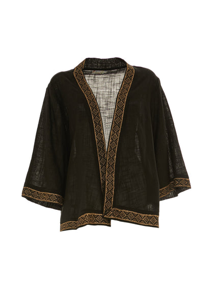A short kimono with elegant long sleeves, embellished with refined block print motifs decorating the edges. A model that combines style and versatility, a distinctive piece that adds character to any outfit.