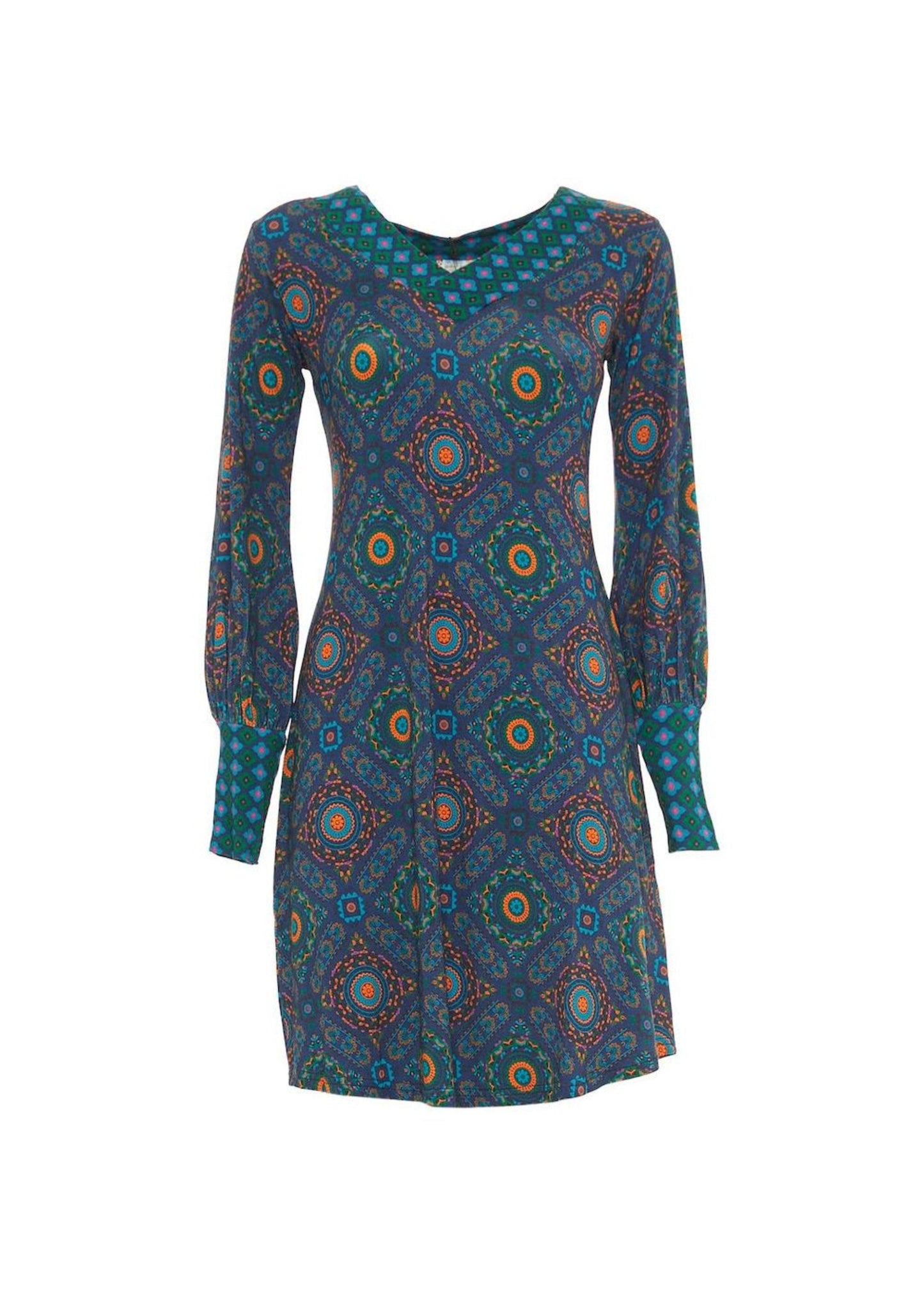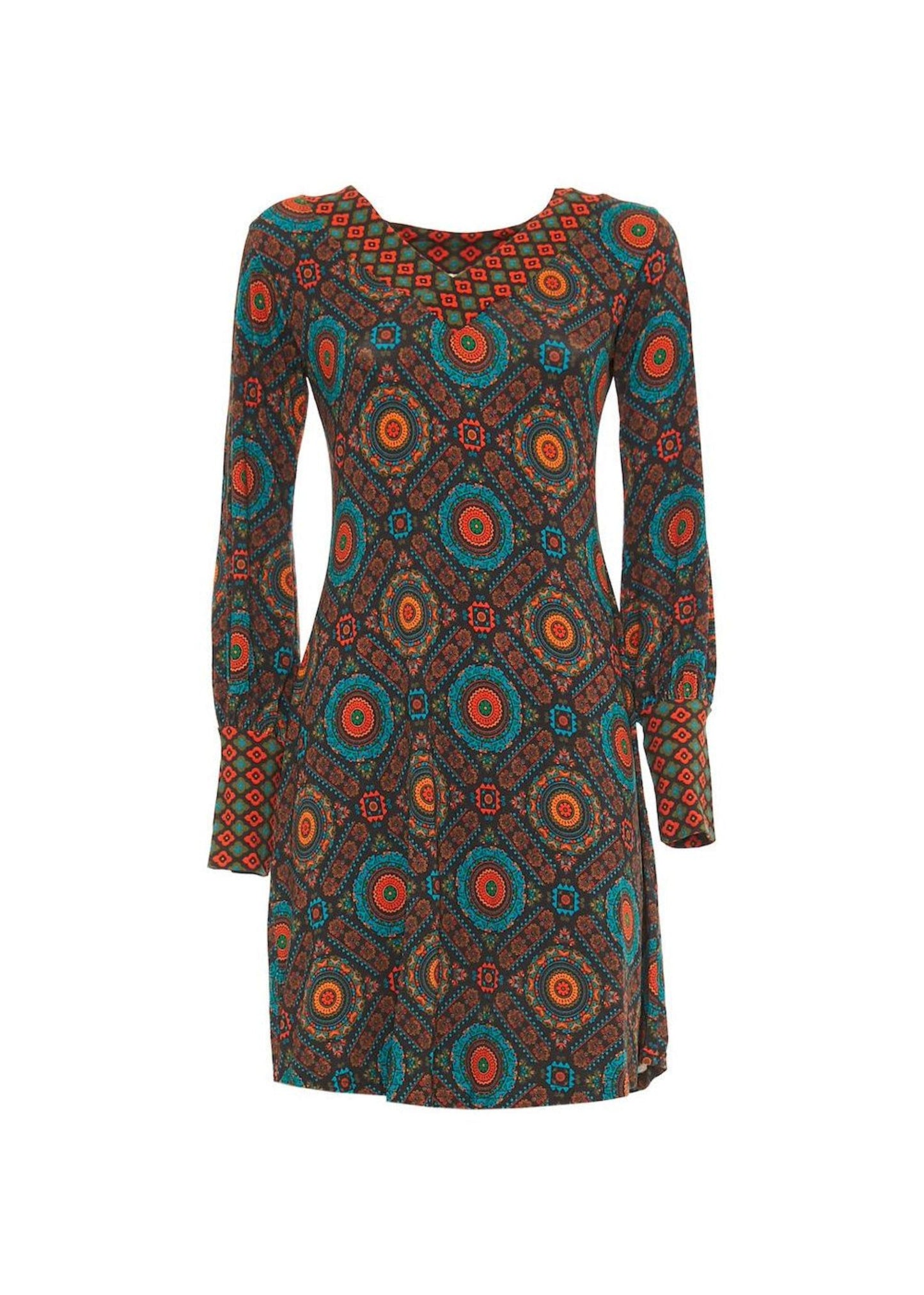 The Urban Marks mini dress by Baba Design is a structured sheath dress with a waist and round neckline that elegantly accentuates the feminine figure. The cuffed sleeve creates a sophisticated look. The vintage pattern adds a touch of timeless style.