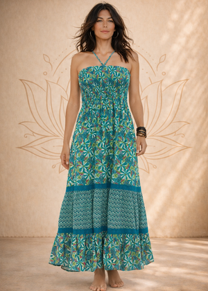 Vestido largo, modelo gitano, con lazo al cuello tipo bikini.