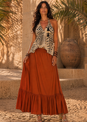 Abbinala a un top bianco o naturale per il Nero, oppure a un top panna o senape per esaltare il Ruggine. Perfetta con sandali in cuoio e gioielli etnici in argento o ottone.