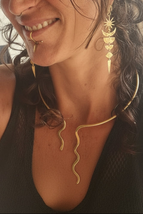 El collar Snake Flow es una joya de diseño minimalista y esencial, que envuelve el cuello con líneas sinuosas y fluidas.