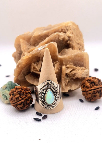 El anillo Rainbow Opal es una joya exclusiva, realizada en plata y enriquecida con una piedra semipreciosa de ópalo arcoíris. Los detalles de incrustaciones alrededor de la piedra dan un toque de elegancia mientras que el ajuste garantiza un ajuste perfecto.