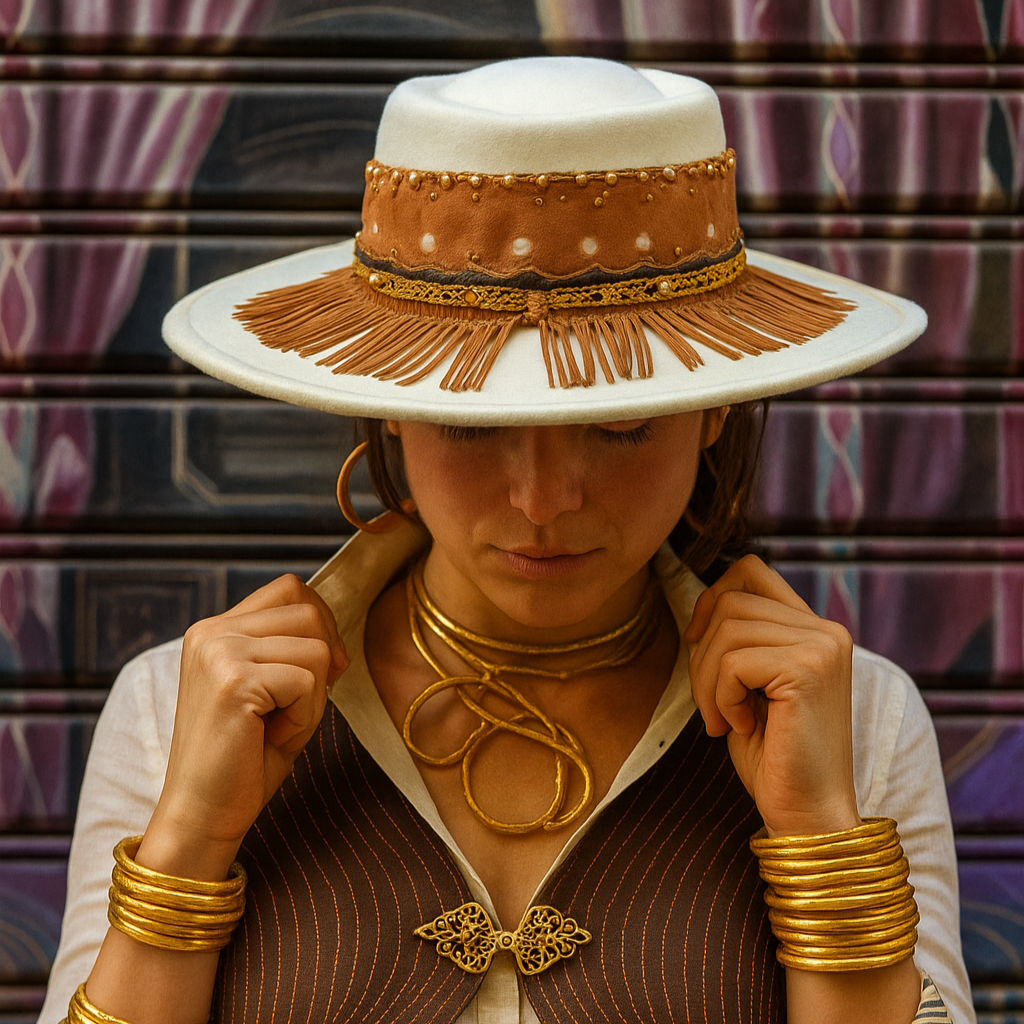 Lasciati ispirare dallo spirito libero del deserto con il cappello "South Boho", realizzato in feltro bianco e decorato a mano con frange in pelle cuoio, borchie dorate e una fascia traforata.