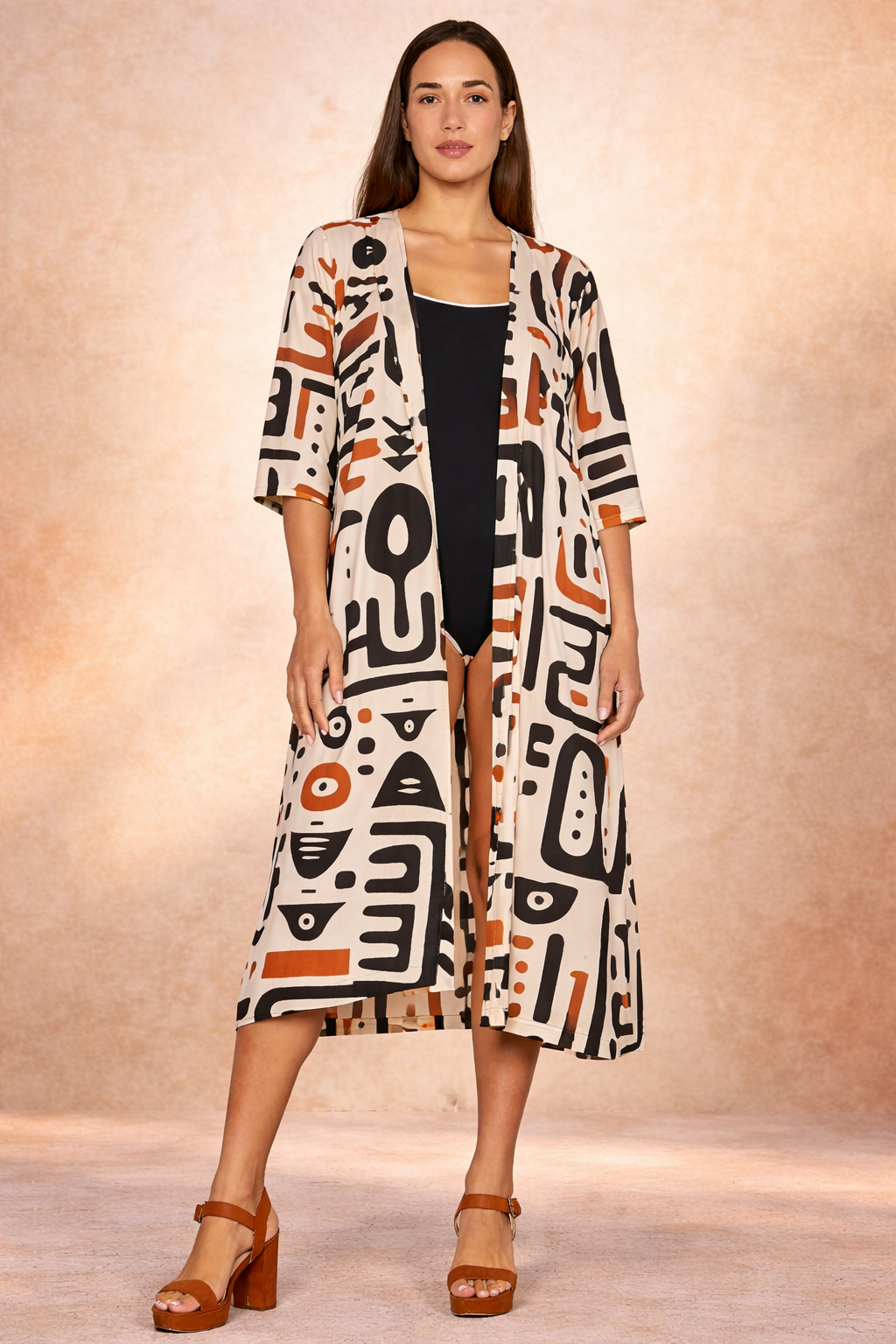 Kimono lungo della linea Afro Sand con stampa etnica grafica nei toni sabbia, nero e terracotta.