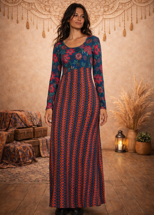 Rivoluziona il tuo stile con il vestito lungo Colors Revolution di Baba Design. L'ammaliante accostamento di motivo floreale ea righe delineato da una riga obliqua di bottoncini, insieme al taglio svasato e allo scollo rotondo, ti farà risplendere in ogni occasione.