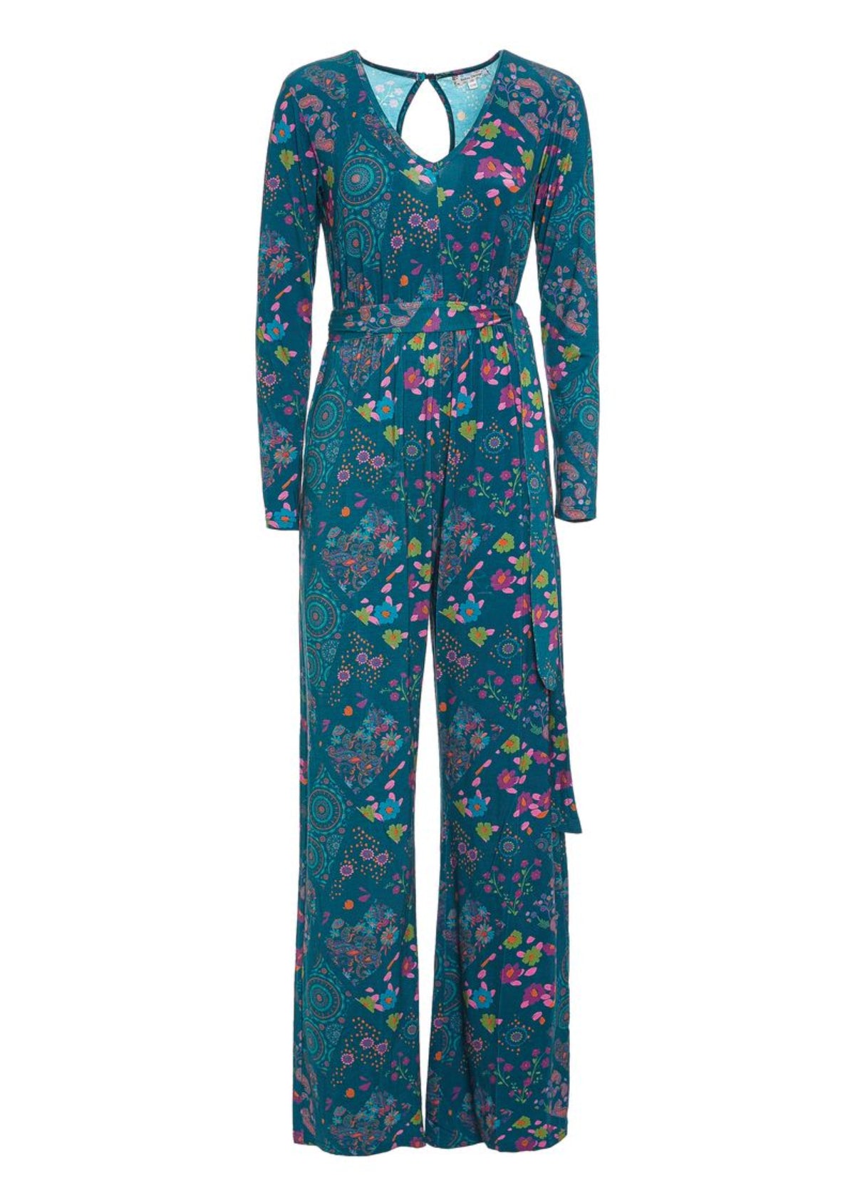 Mono de manga larga con pantalón largo de corte recto. Escote de pico en la parte delantera y ojo de cerradura en la espalda.
