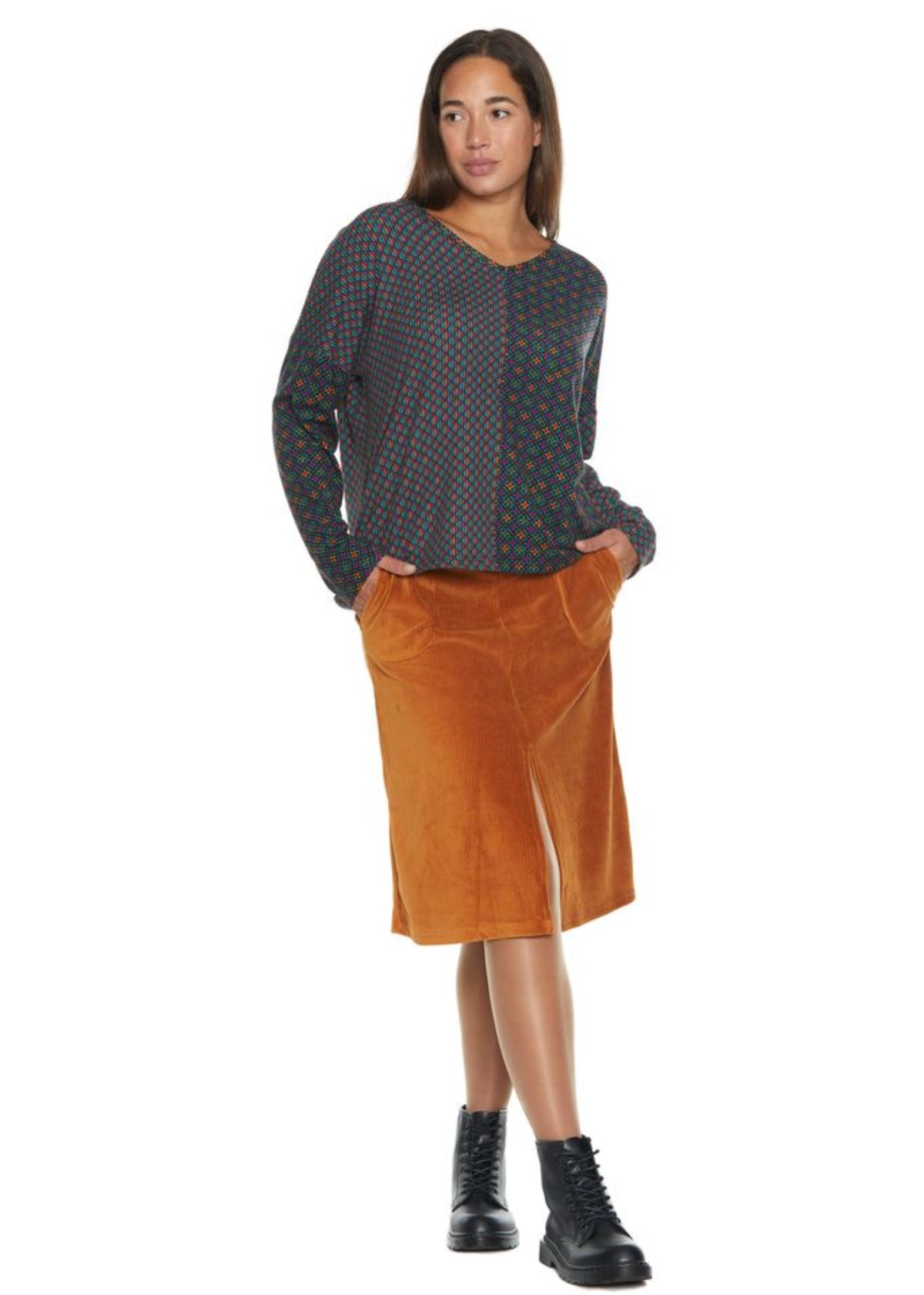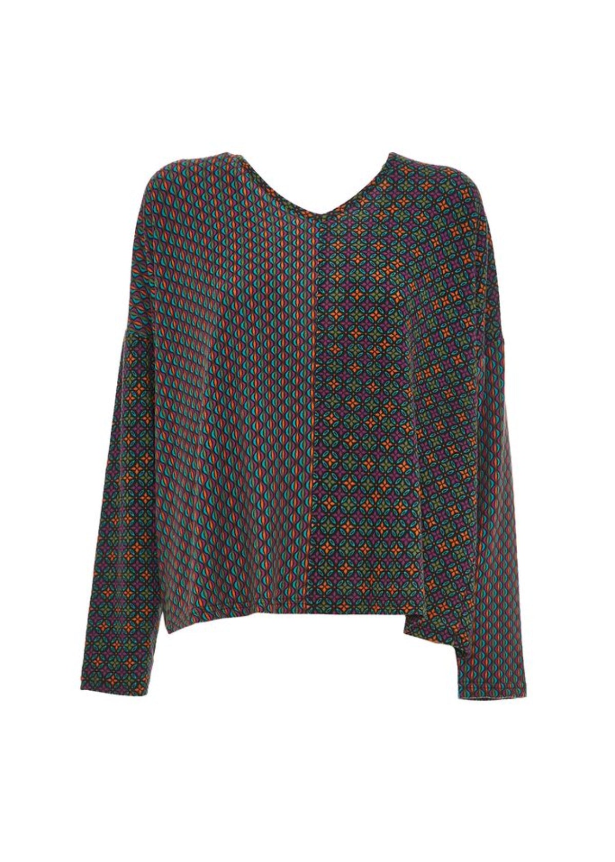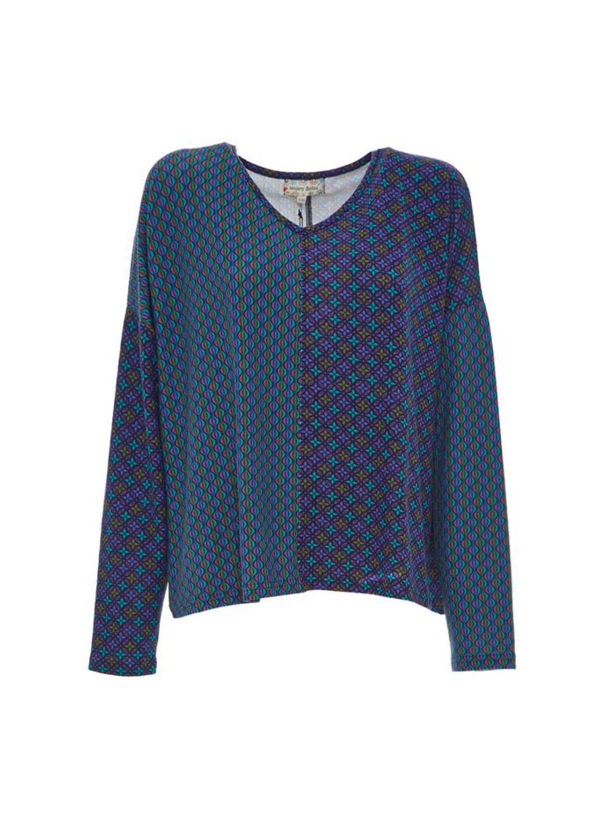 Lleva esta camisa holgada de la línea curvy Happy Baba. El escote tiene forma de V, el patrón del molde es geométrico. Utilízalos tanto en las ocasiones más relajadas como en las más elegantes, ¡un look moderno y único para cada ocasión!