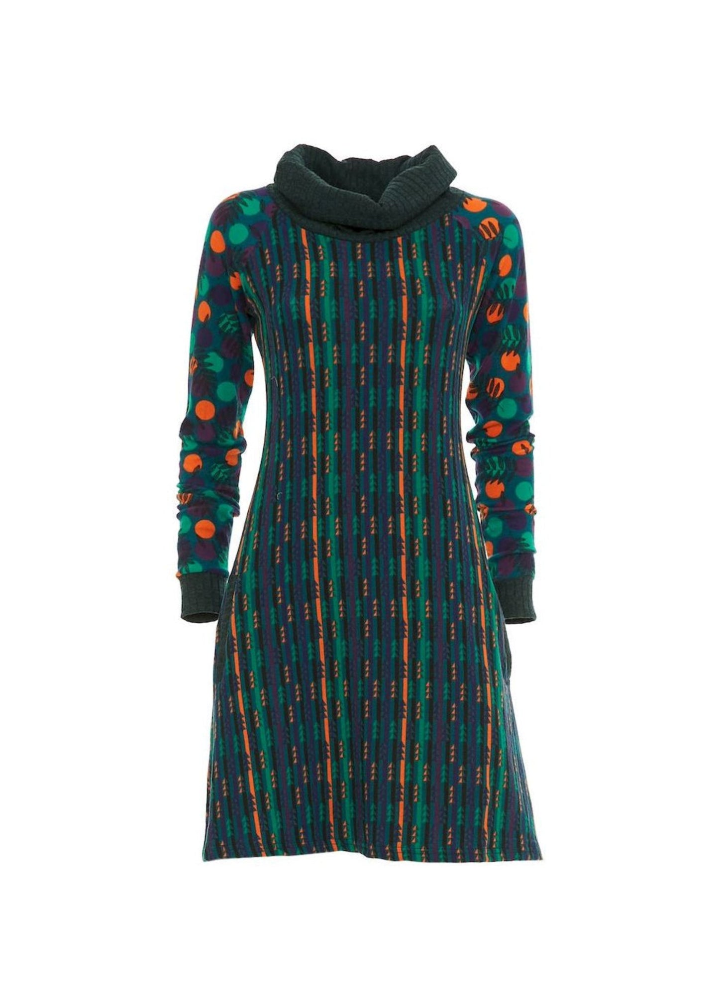 Il vestito Mural Visions di Baba Design è un abito midi con collo rotondo, morbido e monocromo a contrasto. Linea svasata, maniche affusolate con polsino in evidenza. Pattern geometrico che lo caratterizza; per un look originale e versatile.