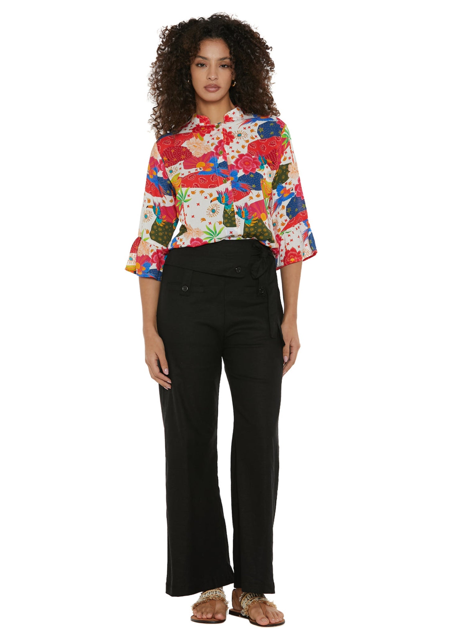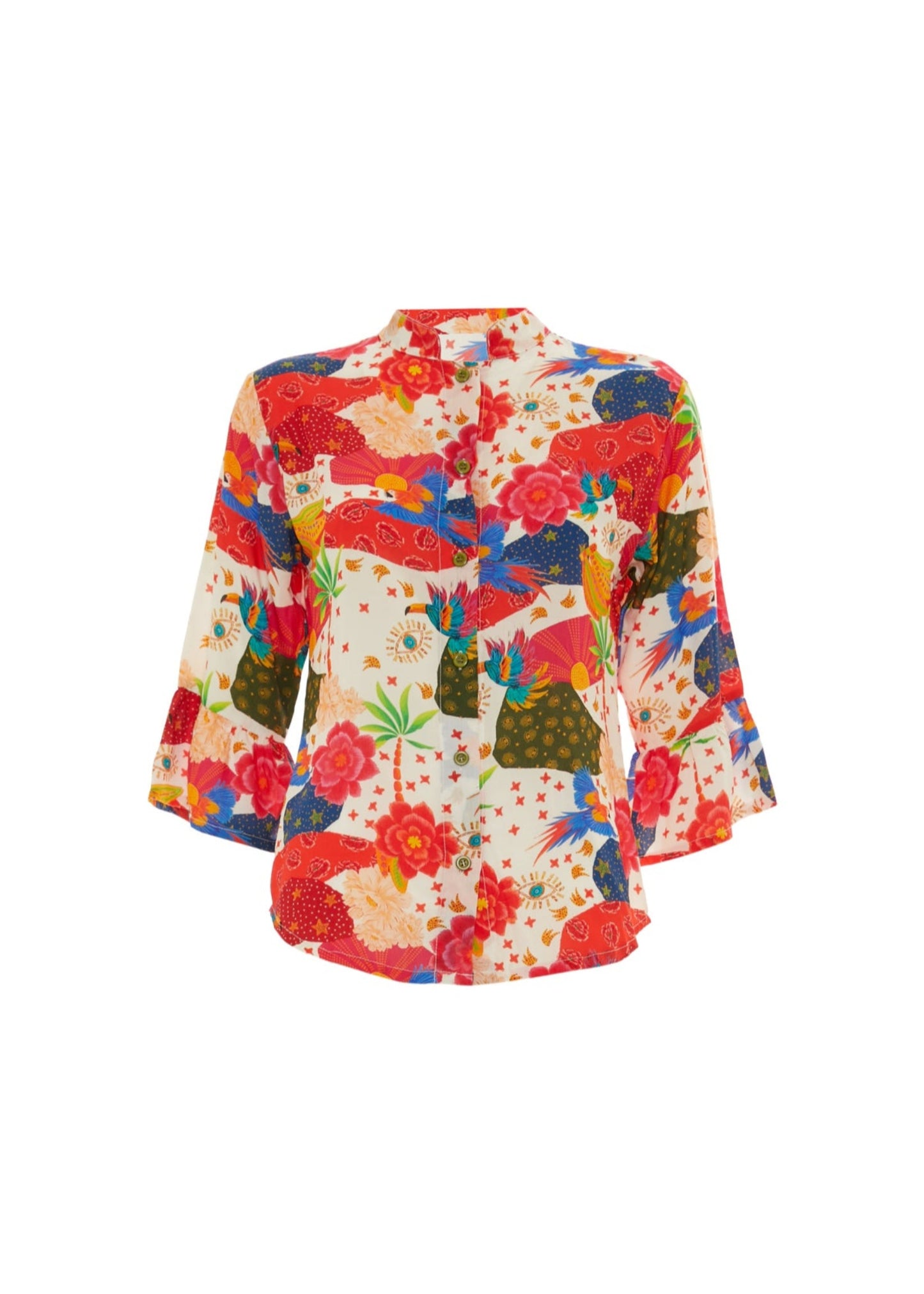 Una camicetta dallo stile divertente e unico! Scollo coreano, maniche a tre quarti e pattern tropicale, per aggiungere una nota di colore e allegria alla tua estate.