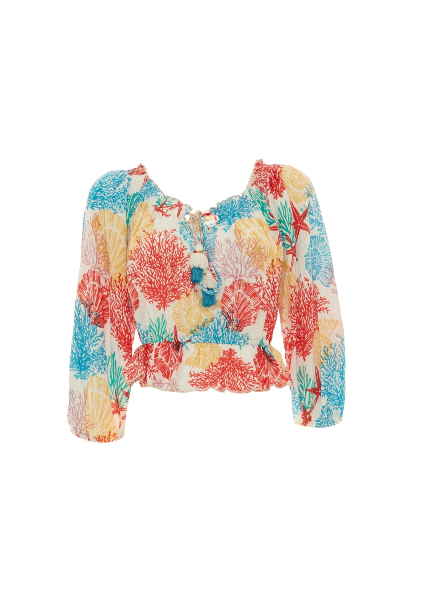 Ecco un top camicetta perfetto per le amanti del gusto boho chic. Con le maniche tre quarti e lo scollo largo, è comoda e perfetta per l'estate. Il pattern marino darà un tocco di freschezza al tuo outfit.
